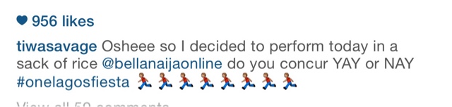 Would you rock Tiwa Savage sack of rice gown? The singer wore the outfit to perform for the One Lagos Fiesta Concert. Would this be a trend or trash?